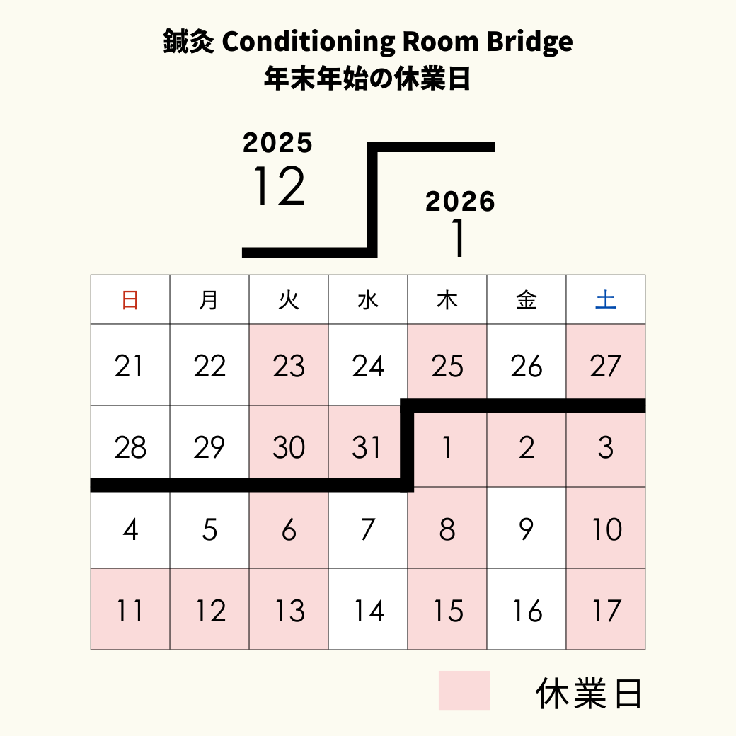 年末年始の休業日お知らせXFacebookコピー2025.11.24この記事は約1分で読めます。年末年始は2025年12月29日(月)まで営業2026年 1 月 4 日(日)から営業開始12/30(火)〜1/3(土)まで休業日となります。また1/11(日)と1/12(月・祝)も休業日とさせていただきます。その他 12月・1月は通常通り(火)(木)(土)が休業日になります。